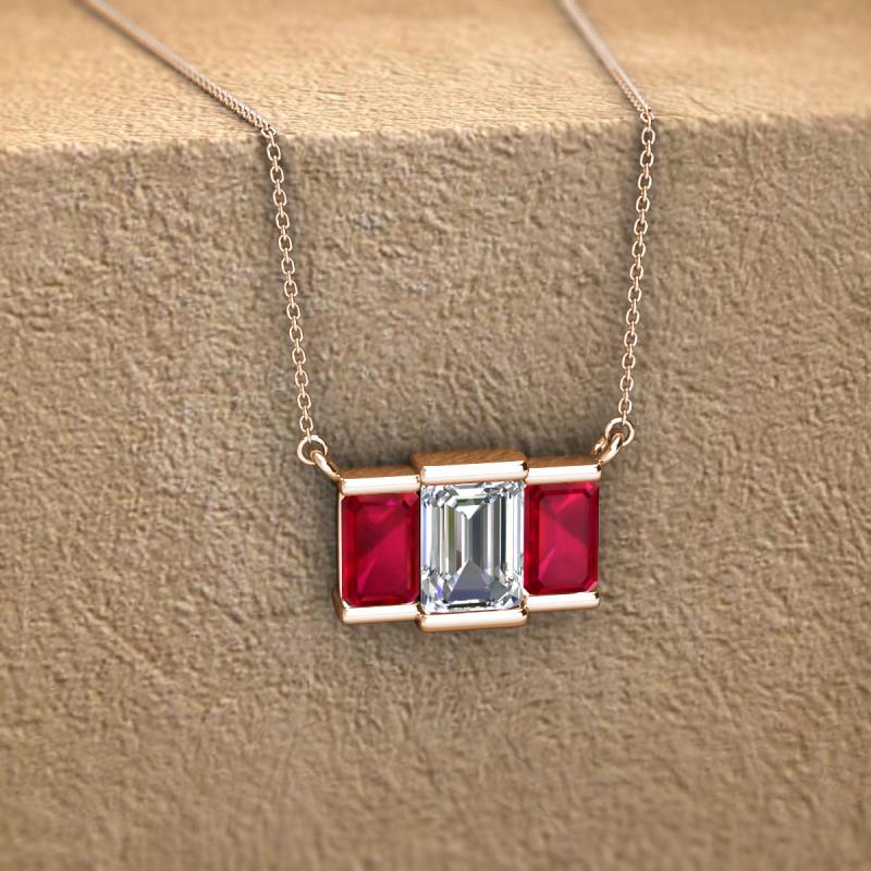 Emerald Shape (6x4 mm) GIA Certified Diamond and Ruby 1.30 ctw Womens Three Stone Pendant Necklace 18K Rose Gold.Included 16 Inches 18K Rose Gold Chain. More Details ...