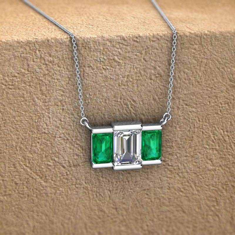 Represent your undying love and commitment with this charming 3 Stone Pendant in Platinum. The necklace displays Center Emerald Shape Lab Grown Diamond accompanied with two emerald shape Emerald in channel setting. It perfectly symbolizes the past, present and the future.