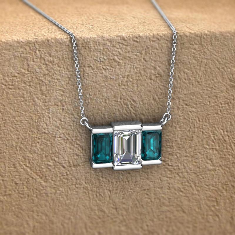 Represent your undying love and commitment with this charming 3 Stone Pendant in 14K White Gold. The necklace displays Center Emerald Shape Lab Grown Diamond accompanied with two emerald shape London Blue Topaz in channel setting. It perfectly symbolizes the past, present and the future.