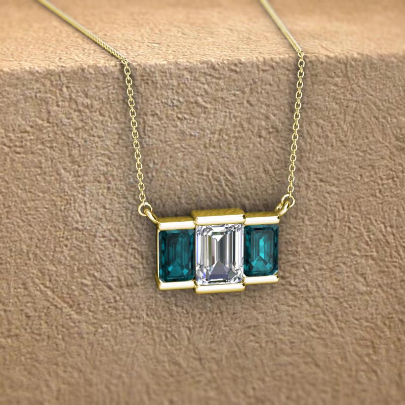 Represent your undying love and commitment with this charming 3 Stone Pendant in 14K Yellow Gold. The necklace displays Center Emerald Shape Lab Grown Diamond accompanied with two emerald shape London Blue Topaz in channel setting. It perfectly symbolizes the past, present and the future.