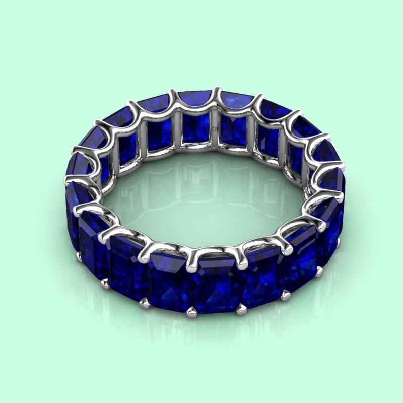 Luxurious combination of Elegance and Beauty, this heirloom quality Eternity Band has Emerald Cut Created Blue Sapphire that exude sheer brilliance and is highly flattering on the hand.