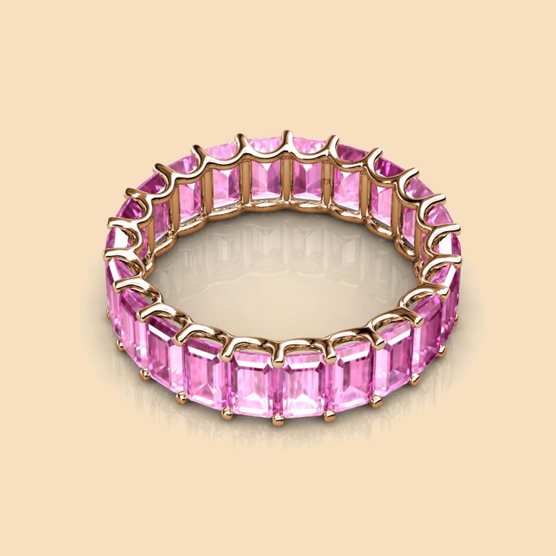 Luxurious combination of Elegance and Beauty, this heirloom quality Eternity Band has Emerald Cut Created Pink Sapphire that exude sheer brilliance and is highly flattering on the hand.