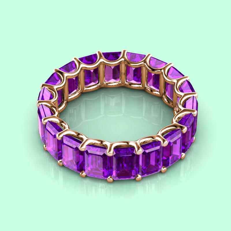 Luxurious combination of Elegance and Beauty, this heirloom quality Eternity Band has Emerald Cut Amethyst that exude sheer brilliance and is highly flattering on the hand.