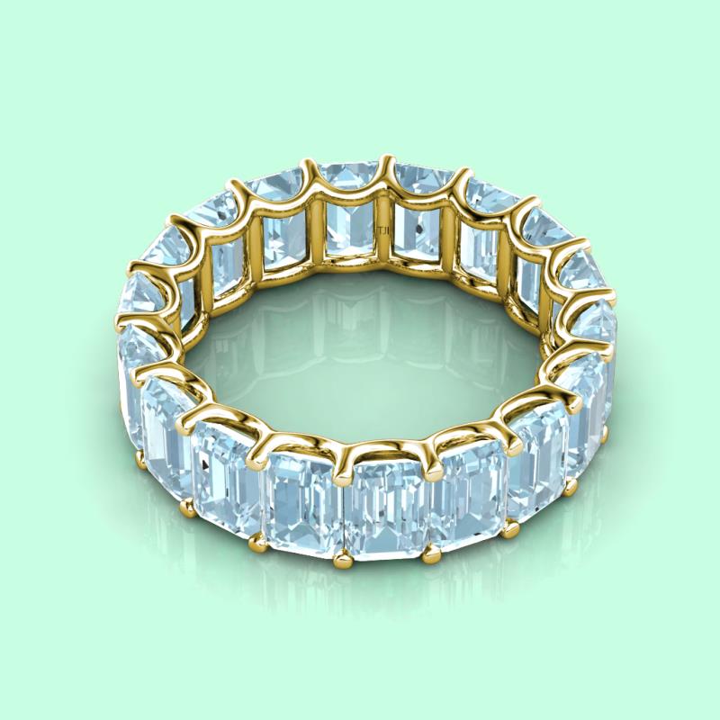 Luxurious combination of Elegance and Beauty, this heirloom quality Eternity Band has Emerald Cut Aquamarine that exude sheer brilliance and is highly flattering on the hand.