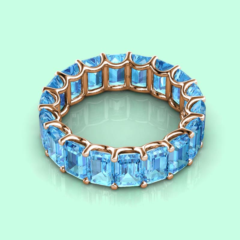 Luxurious combination of Elegance and Beauty, this heirloom quality Eternity Band has Emerald Cut Blue Topaz that exude sheer brilliance and is highly flattering on the hand.