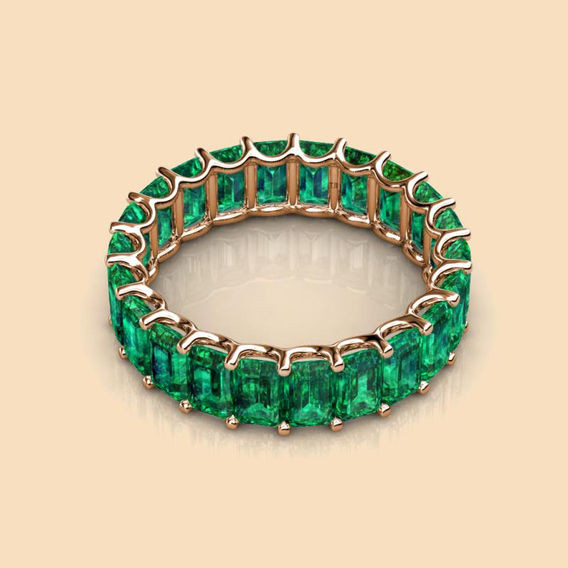 Luxurious combination of Elegance and Beauty, this heirloom quality Eternity Band has Emerald Cut Emerald that exude sheer brilliance and is highly flattering on the hand.