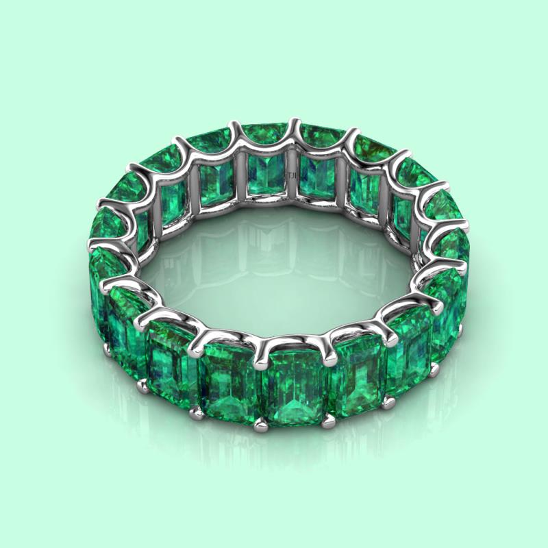 Luxurious combination of Elegance and Beauty, this heirloom quality Eternity Band has Emerald Cut Emerald that exude sheer brilliance and is highly flattering on the hand.