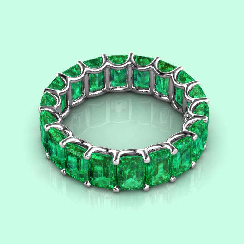 Luxurious combination of Elegance and Beauty, this heirloom quality Eternity Band has Emerald Cut Heirloom Emerald that exude sheer brilliance and is highly flattering on the hand.