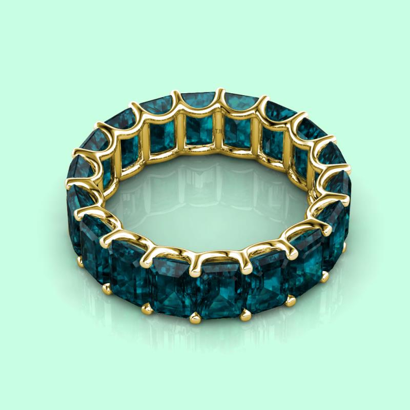 Luxurious combination of Elegance and Beauty, this heirloom quality Eternity Band has Emerald Cut London Blue Topaz that exude sheer brilliance and is highly flattering on the hand.