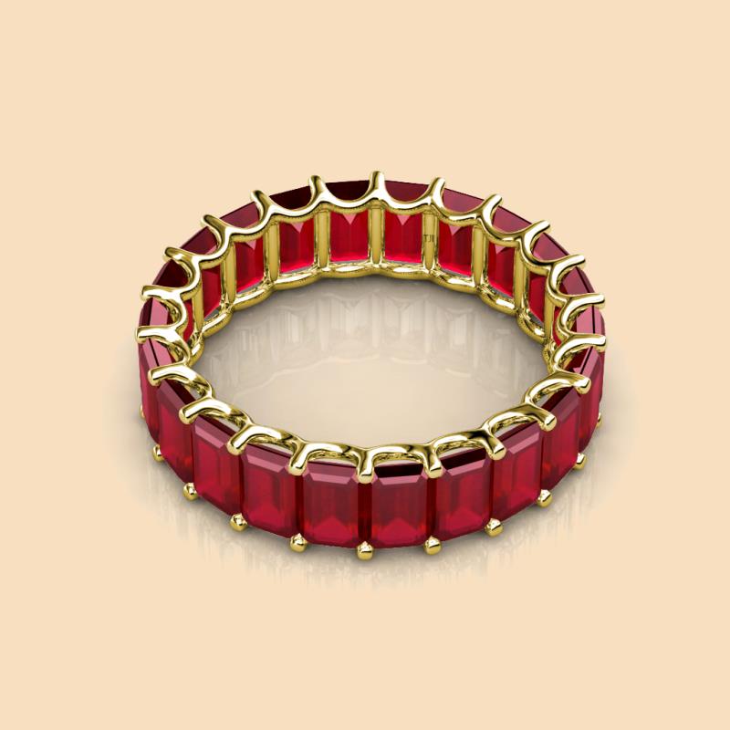 Luxurious combination of Elegance and Beauty, this heirloom quality Eternity Band has Emerald Cut Ruby that exude sheer brilliance and is highly flattering on the hand.