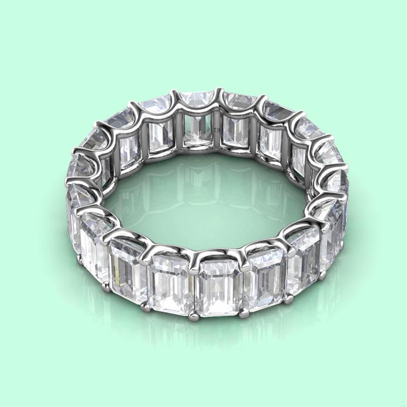 Luxurious combination of Elegance and Beauty, this heirloom quality Eternity Band has Emerald Cut White Sapphire that exude sheer brilliance and is highly flattering on the hand.