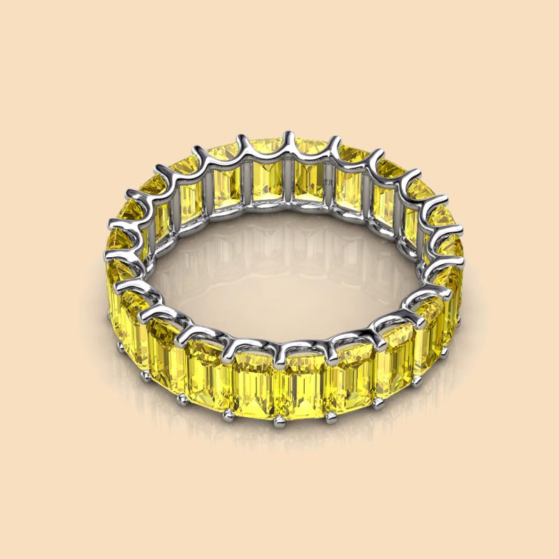 Luxurious combination of Elegance and Beauty, this heirloom quality Eternity Band has Emerald Cut Yellow Sapphire that exude sheer brilliance and is highly flattering on the hand.