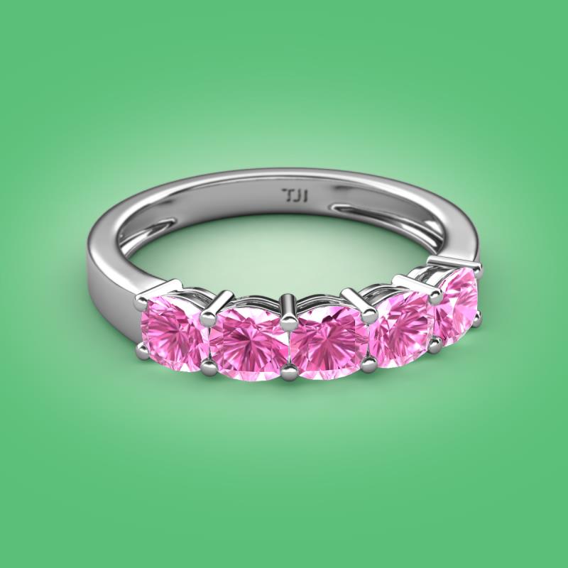 Bring on the bling with this ring of 1.70 ctw Cushion Shape Created Pink Sapphire Side Gallery 5 Stone Wedding Band, for those who want everyone to know that they’ve found love.