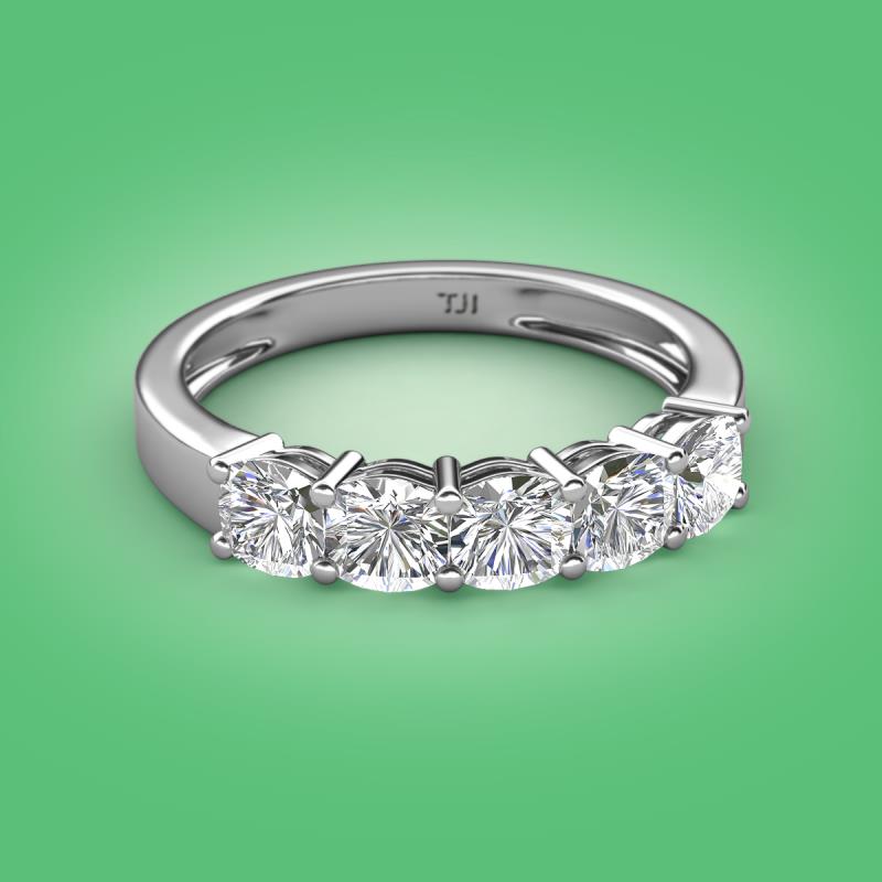 Bring on the bling with this ring of 1.50 ctw Cushion Shape Moissanite Side Gallery 5 Stone Wedding Band, for those who want everyone to know that they’ve found love.