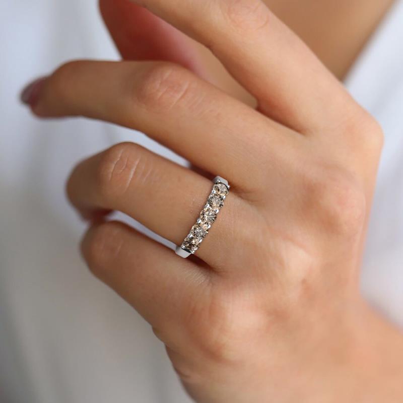 Celebrate your eternal love with our exquisite 5 Stone Wedding Band of 1.19 ctw featuring five precious Smoky Quartz with side gallery design adds a touch of elegance and intricacy, while the U prong setting securely holds each stone in place enhancing their sparkle and brilliance,symbolizing the milestones of your journey together.