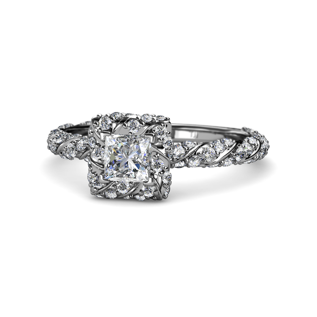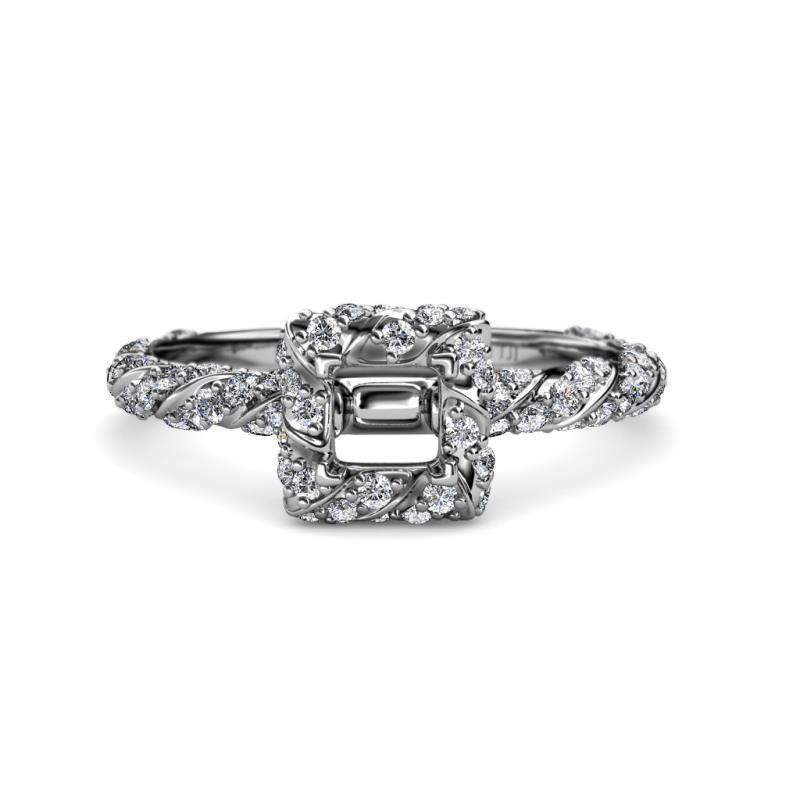 Express Your love and ask her to be yours forever with this exquisite Semi Mount Halo Engagement Ring featuring Center 4 Prong Head with Halo of single row Pave Set Diamonds overlapping by swirl rope single row Pave Shank.
