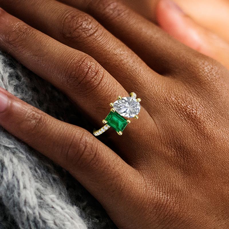 Contrasting stones gives a 2 stone duo ring a fashion-forward vibe. Crafted with IGI Certified Pear Lab Grown Diamond and an Emerald Cut Lab Created Emerald with 16 diamonds studded on the polished shoulders of the stunning ring for enhanced beauty.