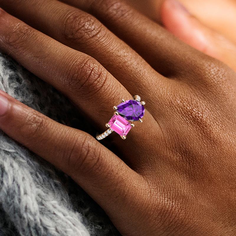 Contrasting stones gives a 2 stone duo ring a fashion-forward vibe. Crafted with Pear Amethyst and an Emerald Cut Lab Created Pink Sapphire with 16 diamonds studded on the polished shoulders of the stunning ring for enhanced beauty.