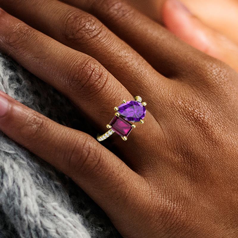 Contrasting stones gives a 2 stone duo ring a fashion-forward vibe. Crafted with Pear Amethyst and an Emerald Cut Rhodolite Garnet with 16 diamonds studded on the polished shoulders of the stunning ring for enhanced beauty.