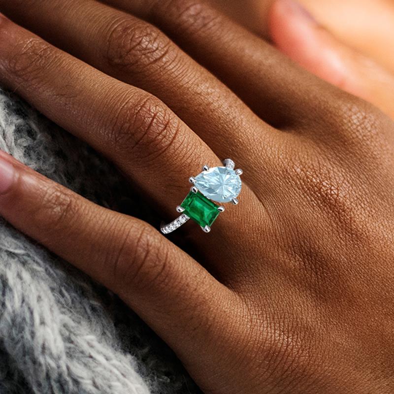 Contrasting stones gives a 2 stone duo ring a fashion-forward vibe. Crafted with Pear Aquamarine and an Emerald Cut Lab Created Emerald with 16 diamonds studded on the polished shoulders of the stunning ring for enhanced beauty.