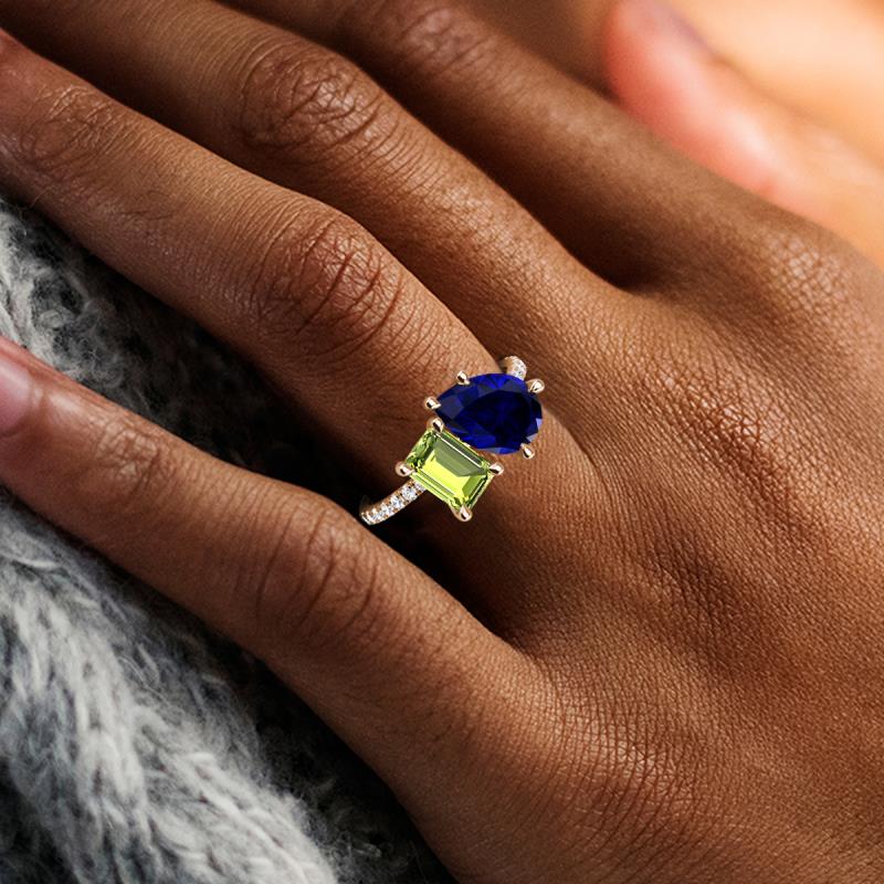 Contrasting stones gives a 2 stone duo ring a fashion-forward vibe. Crafted with Pear Blue Sapphire and Emerald Cut Peridot with 16 diamonds studded on the polished shoulders of the stunning ring for enhanced beauty.