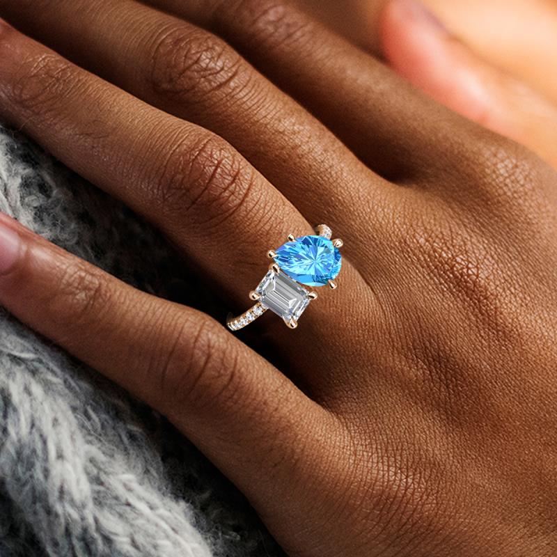 Contrasting stones gives a 2 stone duo ring a fashion-forward vibe. Crafted with Pear Blue Topaz and GIA Certified Emerald Cut Diamond with 16 diamonds studded on the polished shoulders of the stunning ring for enhanced beauty.