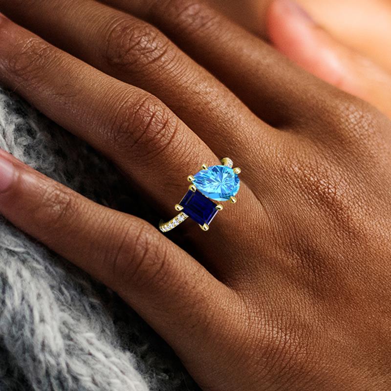 Contrasting stones gives a 2 stone duo ring a fashion-forward vibe. Crafted with Pear Blue Topaz and an Emerald Cut Lab Created Blue Sapphire with 16 diamonds studded on the polished shoulders of the stunning ring for enhanced beauty.