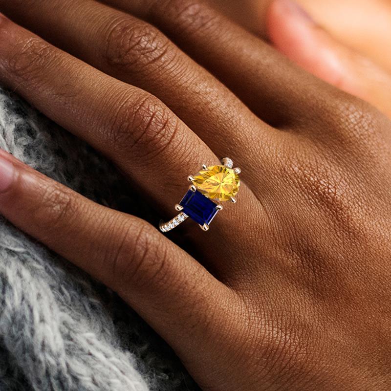 Contrasting stones gives a 2 stone duo ring a fashion-forward vibe. Crafted with Pear Citrine and an Emerald Cut Lab Created Blue Sapphire with 16 diamonds studded on the polished shoulders of the stunning ring for enhanced beauty.