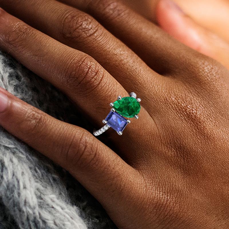 Contrasting stones gives a 2 stone duo ring a fashion-forward vibe. Crafted with Pear Emerald and Emerald Cut Iolite with 16 diamonds studded on the polished shoulders of the stunning ring for enhanced beauty.