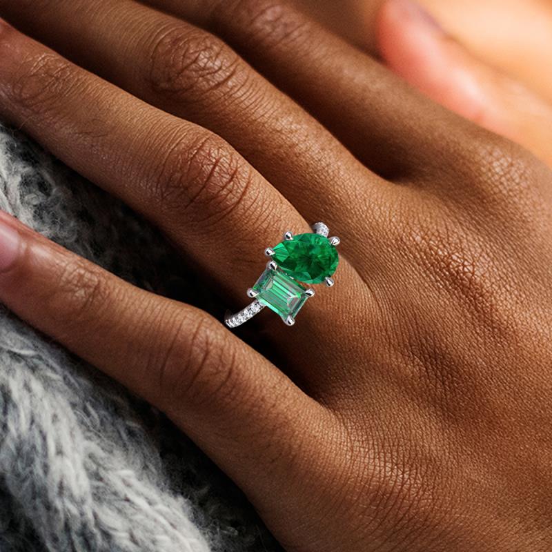 Contrasting stones gives a 2 stone duo ring a fashion-forward vibe. Crafted with Pear Emerald and Emerald Cut Lab Created Alexandrite with 16 diamonds studded on the polished shoulders of the stunning ring for enhanced beauty.