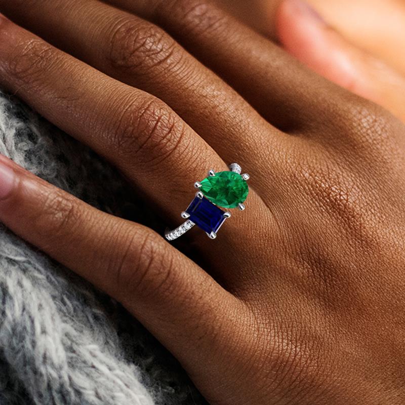 Contrasting stones gives a 2 stone duo ring a fashion-forward vibe. Crafted with Pear Emerald and Emerald Cut Lab Created Blue Sapphire with 16 diamonds studded on the polished shoulders of the stunning ring for enhanced beauty.