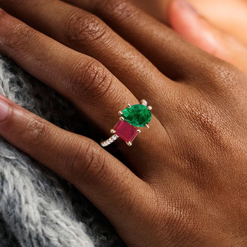 Contrasting stones gives a 2 stone duo ring a fashion-forward vibe. Crafted with Pear Emerald and Emerald Cut Lab Created Ruby with 16 diamonds studded on the polished shoulders of the stunning ring for enhanced beauty.