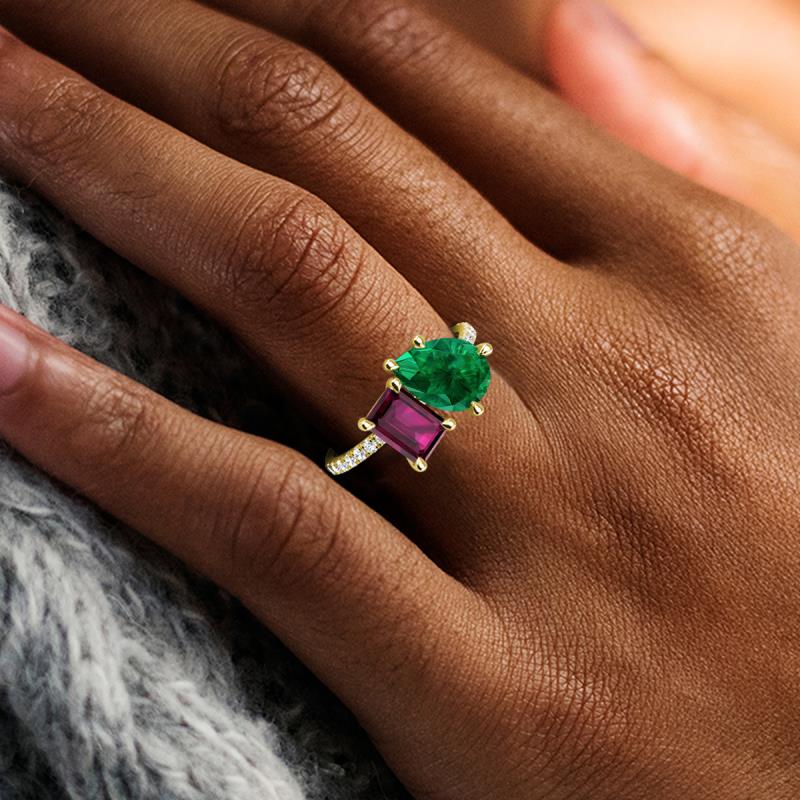 Contrasting stones gives a 2 stone duo ring a fashion-forward vibe. Crafted with Pear Emerald and Emerald Cut Rhodolite Garnet with 16 diamonds studded on the polished shoulders of the stunning ring for enhanced beauty.