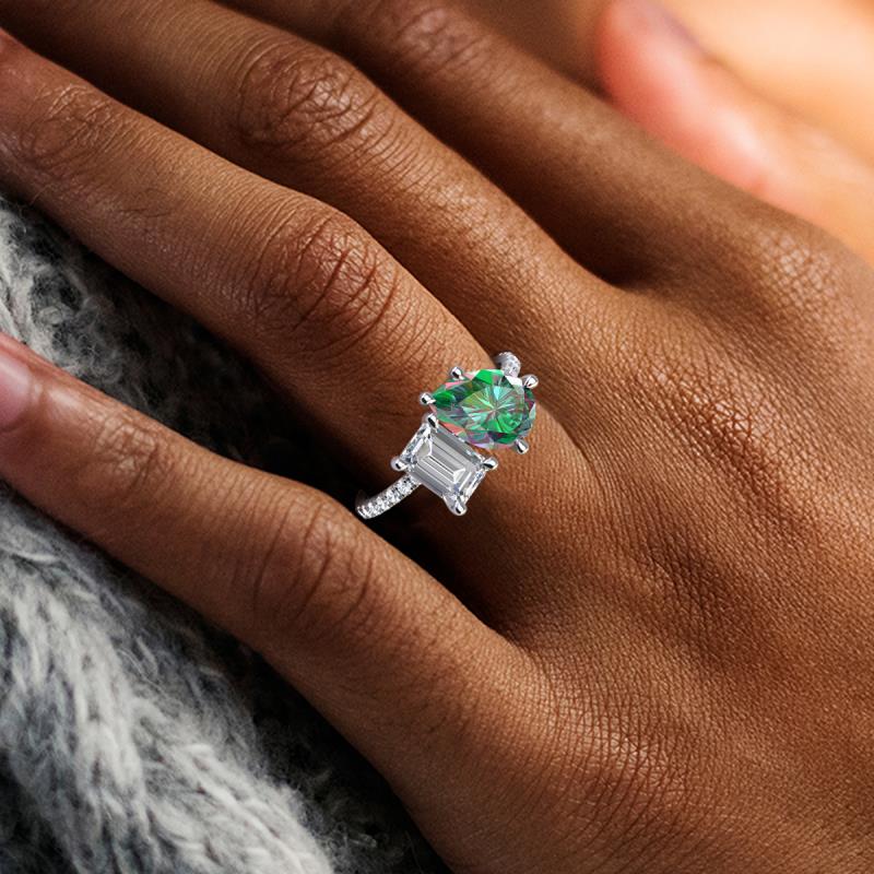 Contrasting stones gives a 2 stone duo ring a fashion-forward vibe. Crafted with Pear Lab Created Alexandrite and an Emerald Cut Forever Brilliant Moissanite with 16 diamonds studded on the polished shoulders of the stunning ring for enhanced beauty.