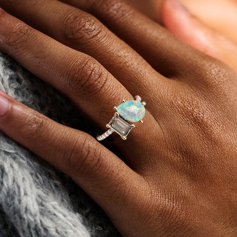 Contrasting stones gives a 2 stone duo ring a fashion-forward vibe. Crafted with Pear Opal and an Emerald Cut Smoky Quartz with 16 diamonds studded on the polished shoulders of the stunning ring for enhanced beauty.