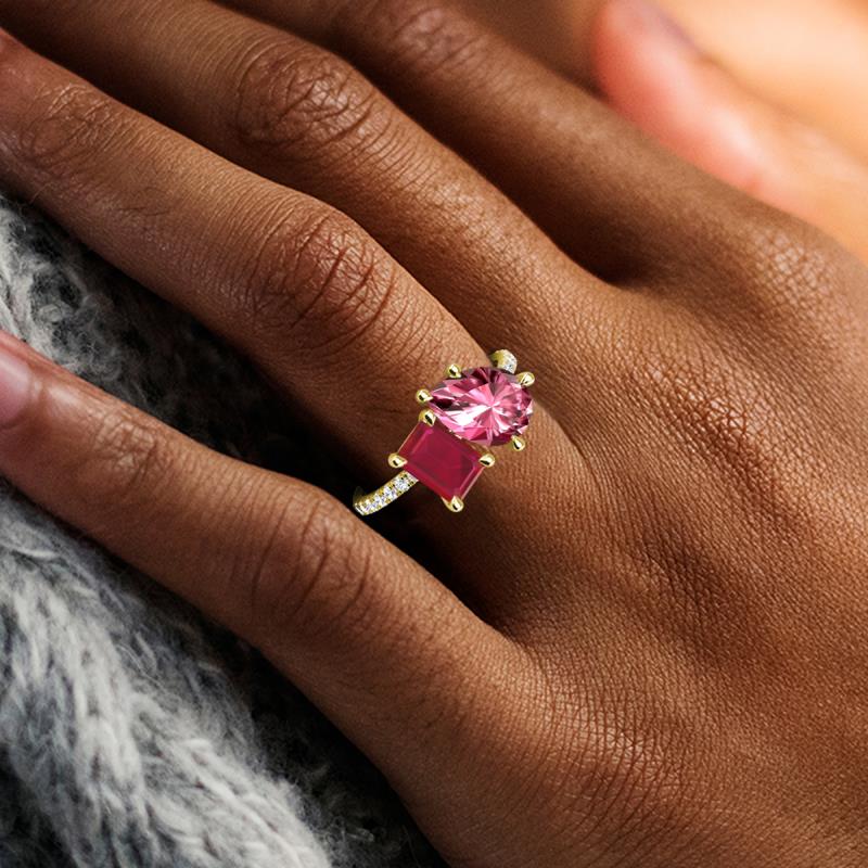 Contrasting stones gives a 2 stone duo ring a fashion-forward vibe. Crafted with Pear Pink Tourmaline and an Emerald Cut Lab Created Ruby with 16 diamonds studded on the polished shoulders of the stunning ring for enhanced beauty.