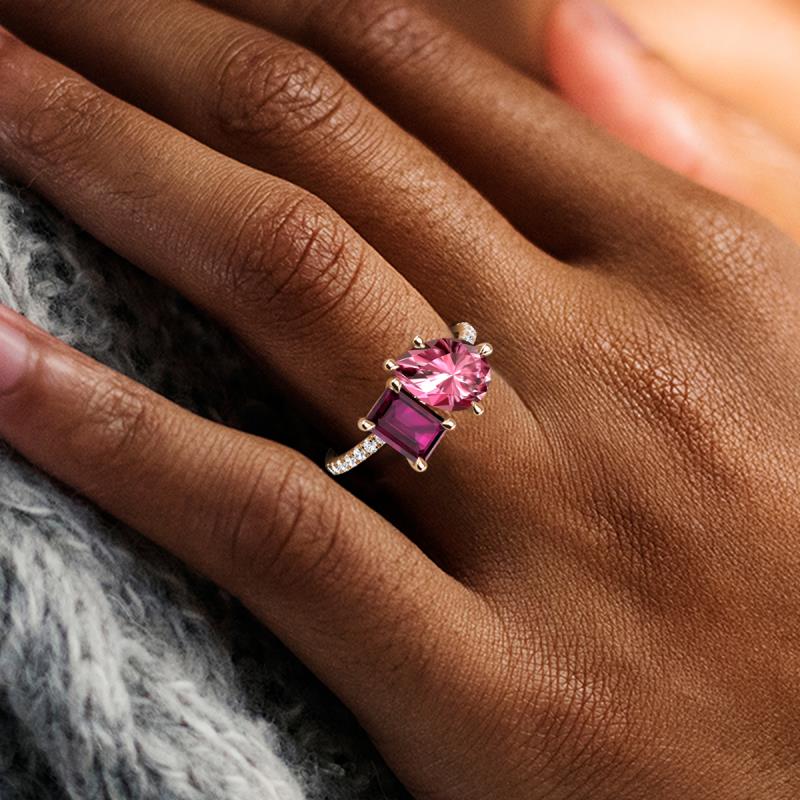Contrasting stones gives a 2 stone duo ring a fashion-forward vibe. Crafted with Pear Pink Tourmaline and an Emerald Cut Rhodolite Garnet with 16 diamonds studded on the polished shoulders of the stunning ring for enhanced beauty.