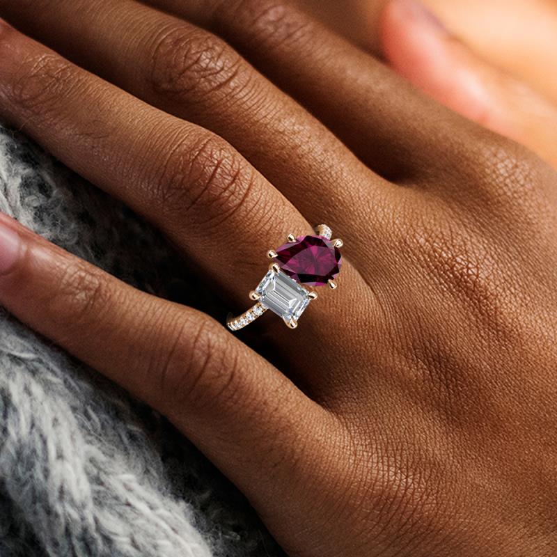 Contrasting stones gives a 2 stone duo ring a fashion-forward vibe. Crafted with Pear Rhodolite Garnet and GIA Certified Emerald Cut Diamond with 16 diamonds studded on the polished shoulders of the stunning ring for enhanced beauty.