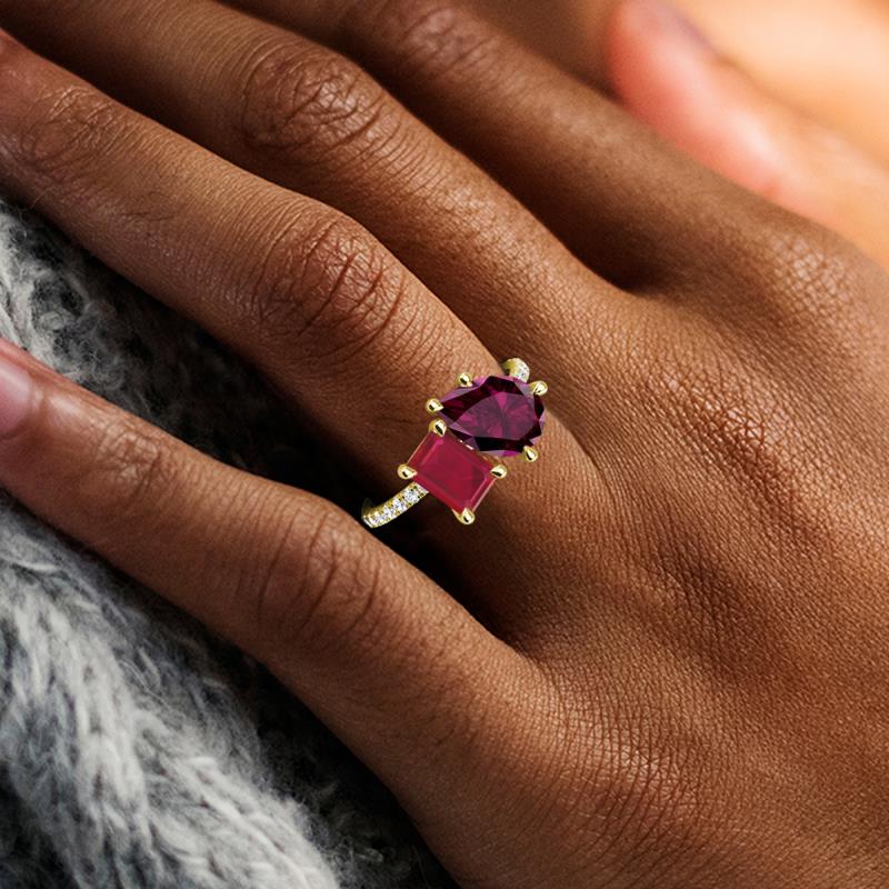 Contrasting stones gives a 2 stone duo ring a fashion-forward vibe. Crafted with Pear Rhodolite Garnet and an Emerald Cut Lab Created Ruby with 16 diamonds studded on the polished shoulders of the stunning ring for enhanced beauty.