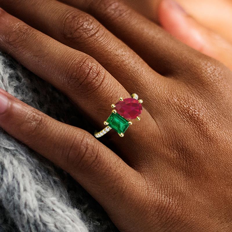 Contrasting stones gives a 2 stone duo ring a fashion-forward vibe. Crafted with Pear Ruby and Emerald Cut Lab Created Emerald with 16 diamonds studded on the polished shoulders of the stunning ring for enhanced beauty.