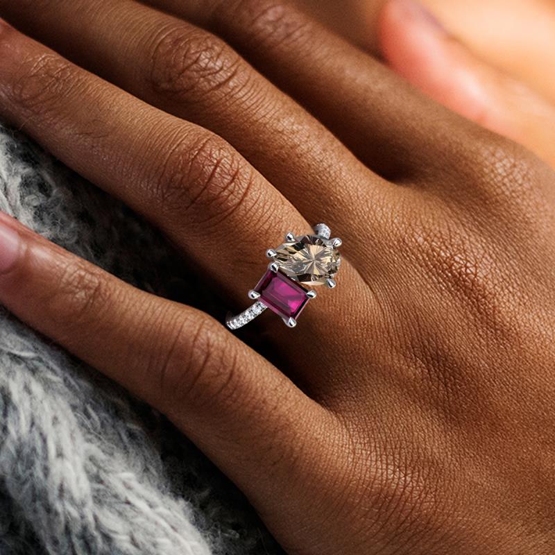 Contrasting stones gives a 2 stone duo ring a fashion-forward vibe. Crafted with Pear Smoky Quartz and an Emerald Cutd Rhodolite Garnet with 16 diamonds studded on the polished shoulders of the stunning ring for enhanced beauty.