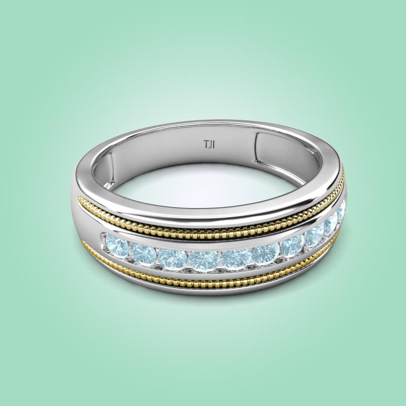 This two toned style with high polished finished edges with twisted wire effect is the best wedding band of 0.35 ctw and Round Aquamarine set in a Channel setting.
