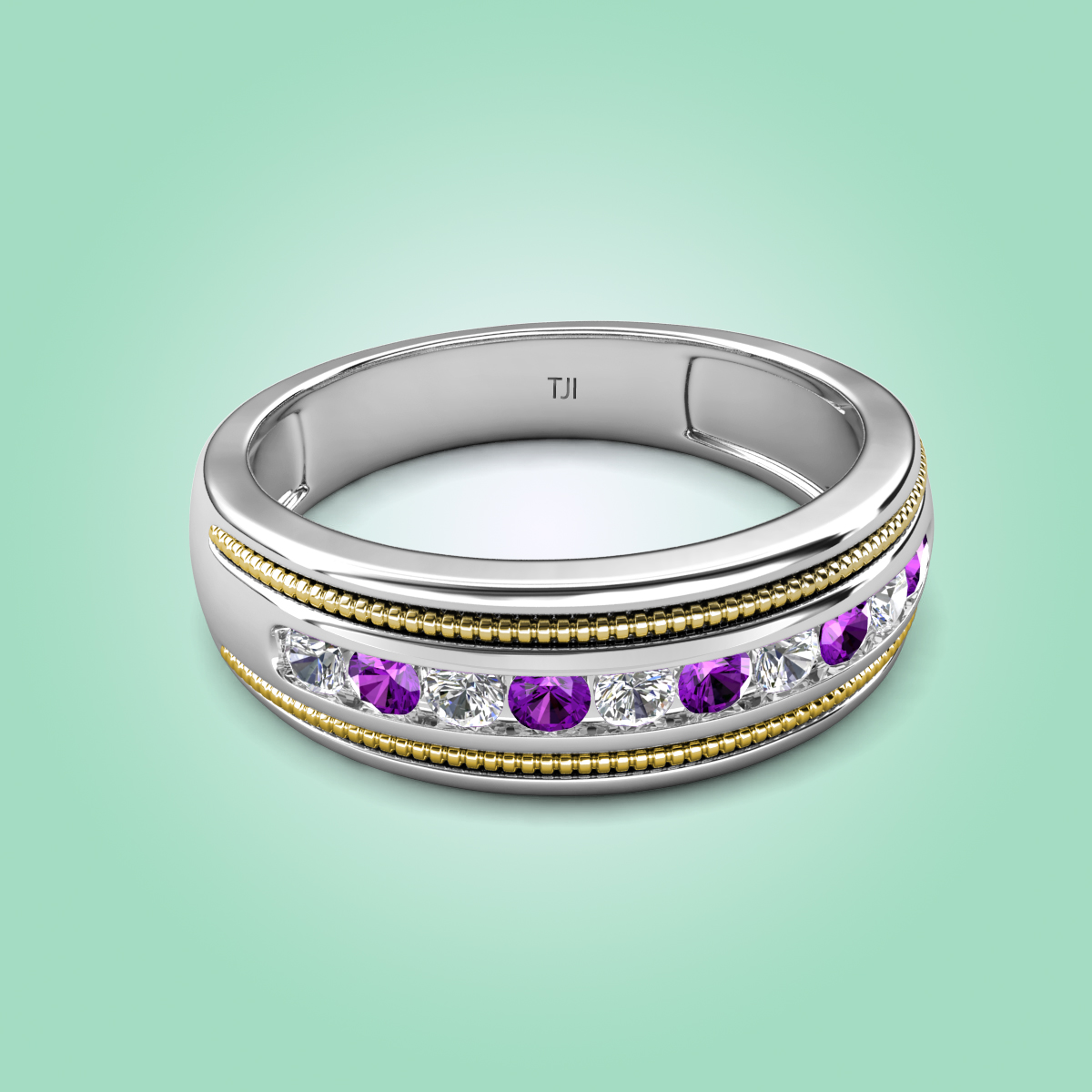 This two toned style with high polished finished edges with twisted wire effect is the best wedding band of 0.58 ctw with Round Lab Grown Diamond and Amethyst set in a Channel setting.