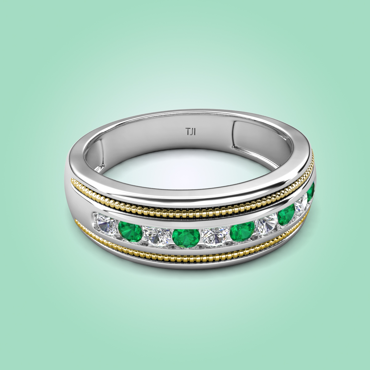 This two toned style with high polished finished edges with twisted wire effect is the best wedding band of 0.43 ctw with Round Lab Grown Diamond and Emerald set in a Channel setting.