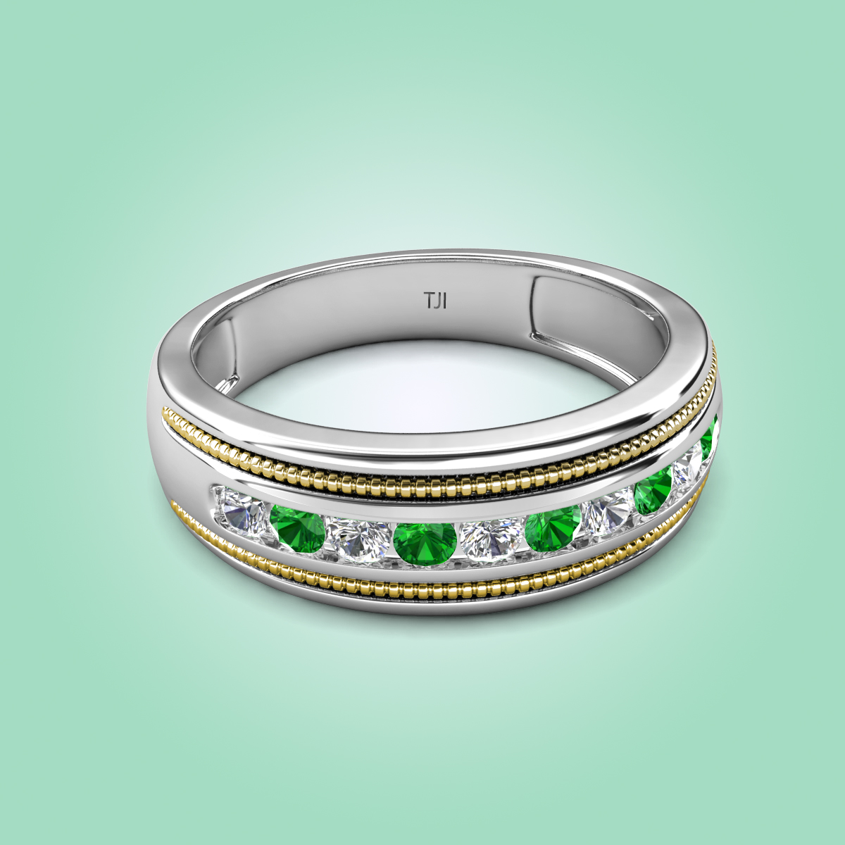 This two toned style with high polished finished edges with twisted wire effect is the best wedding band of 0.57 ctw with Round Lab Grown Diamond and Green Garnet set in a Channel setting.