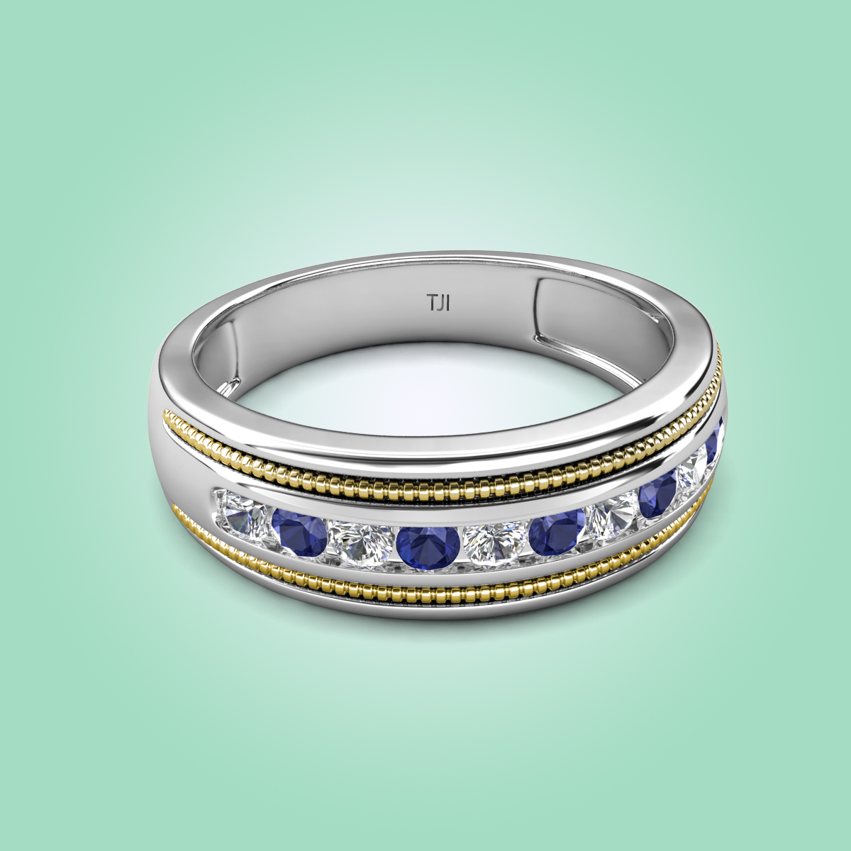 This two toned style with high polished finished edges with twisted wire effect is the best wedding band of 0.43 ctw with Round Lab Grown Diamond and Iolite set in a Channel setting.
