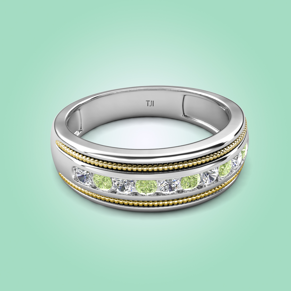 This two toned style with high polished finished edges with twisted wire effect is the best wedding band of 0.50 ctw with Round Lab Grown Diamond and Peridot set in a Channel setting.
