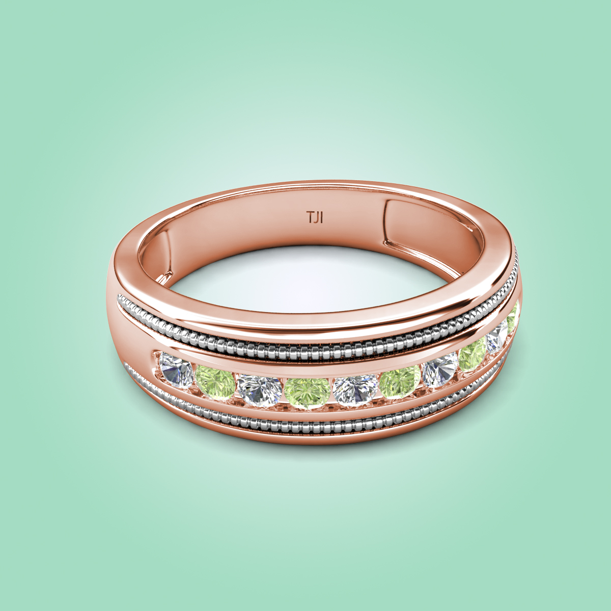 This two toned style with high polished finished edges with twisted wire effect is the best wedding band of 0.50 ctw with Round Lab Grown Diamond and Peridot set in a Channel setting.