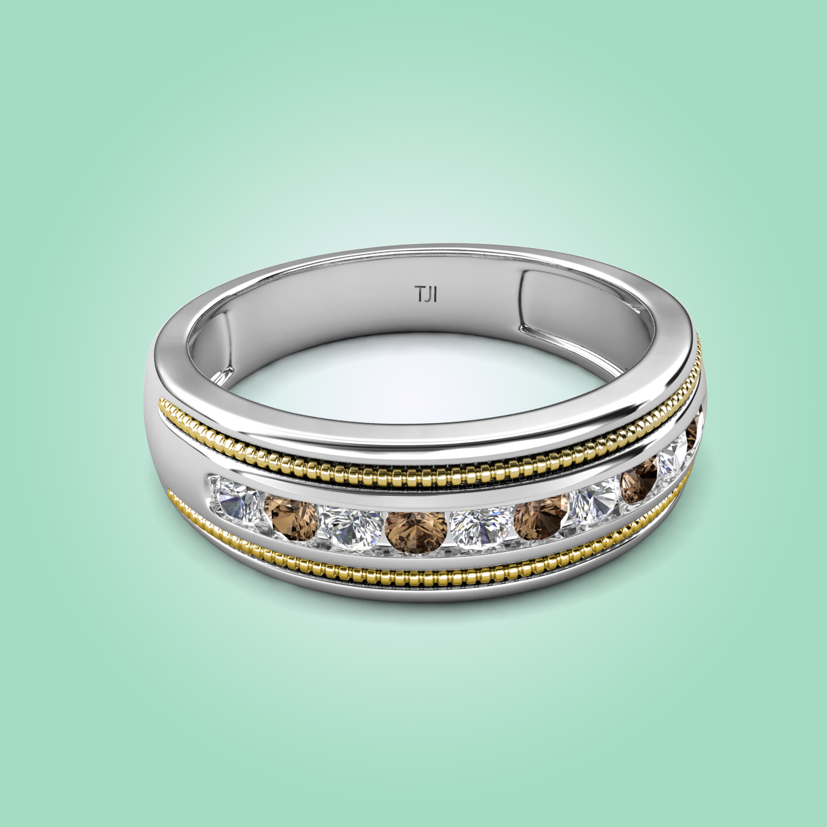 This two toned style with high polished finished edges with twisted wire effect is the best wedding band of 0.50 ctw with Round Lab Grown Diamond and Smoky Quartz set in a Channel setting.