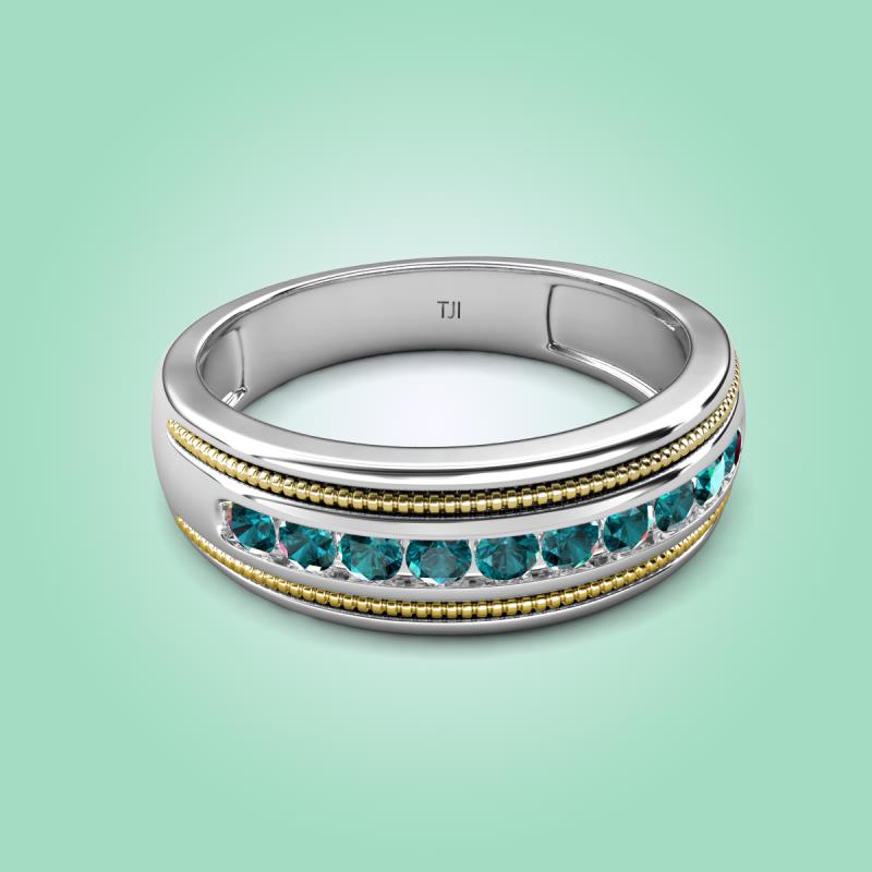 This two toned style with high polished finished edges with twisted wire effect is the best wedding band of 0.50 ctw and Round London Blue Topaz set in a Channel setting.